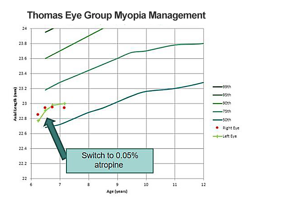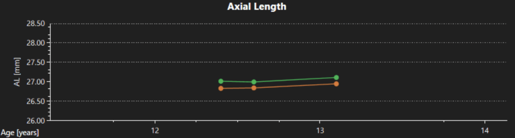 | Baseline | 22.85 mm | 22.75 mm | Started on atropine 0.025% |