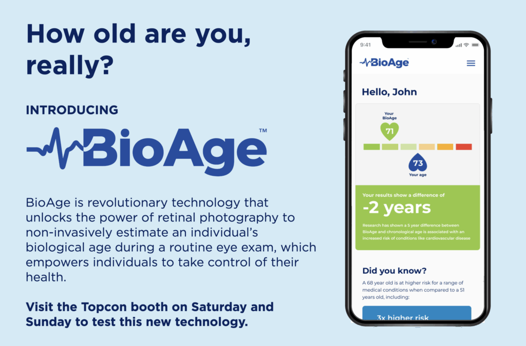 Stop by Booth F2805 on Saturday and Sunday to get your BioAge score. BioAge is revolutionary technology that unlocks the power of retinal photography to non-invasively estimate an individual’s biological age during a routine eye exam, which empowers individuals to take control of their health.