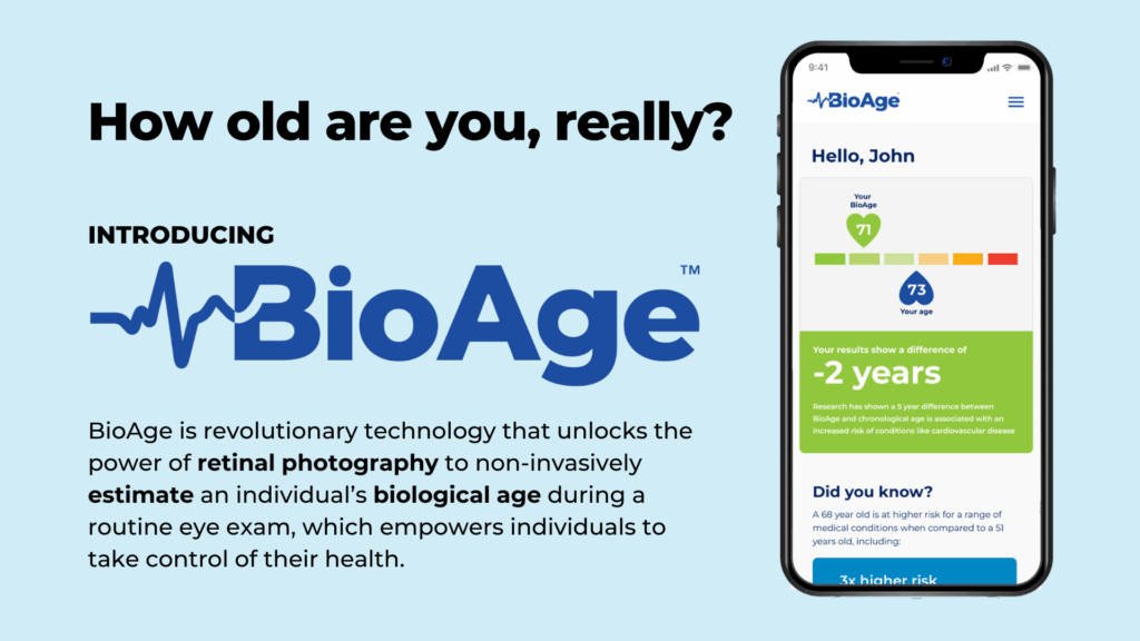 Stop by booth #F11065 to get your BioAge score. BioAge is revolutionary technology that unlocks the power of retinal photography to non-invasively estimate an individual’s biological age during a routine eye exam, which empowers individuals to take control of their health.